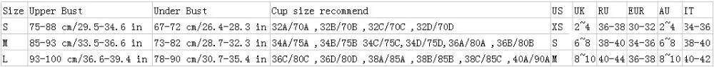 Size S: Upper Bust 75-88 cm/29.5-34.6 in; Under Bust 67-72 cm/26.4-28.3 in; Cup size recommend 32A/70A ,32B/70B ,32C/70C ,32D/70D